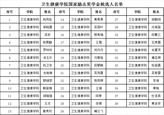 根据《南昌职业大学国家励志奖学金评审细则(修订)》(南职大校字(2025) 65号)、《关于推荐评审2024-2025学年国家励志奖学金候选人的通知》(南职大资助字(2025)9号)等文件要求,卫生健康学院严格遵照评选工作程序,本着公平、公正、公开的原则,由学生本人提出中请,经班级评议小组民主评议,择优推荐,学院评审小组审核、学院党政联席会讨论,最终拟推荐肖雨虹等38名同学为国家励志奖学金候选人(名单附后)。