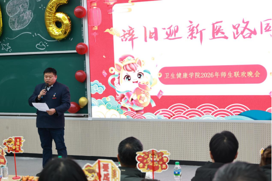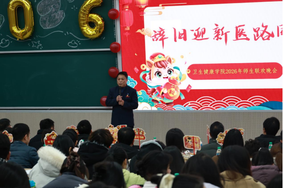 本网讯 卫生健康学院 袁贝贝 报道 冬日暖阳映初心,医路欢歌启新章。为丰富校园文化生活,展现全院师生青春风采与奋进姿态,2026年1月13日晚,卫生健康学院在五号教学楼206教室隆重举办“辞旧迎新 医路同行”迎新年联欢活动。校党委委员、校长助理吴丽华,学院党委书记王欢、副书记申斌、副院长胡立明,学院师生代表及演出人员齐聚一堂,共庆佳节。人文学院党委书记宁江,校人事处杨登老师、校学生事务部李太红老师应邀出席活动。