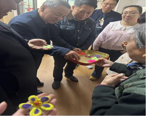 在南昌市第七医院,吴丽华一行在院方负责人陪同下,全面参观老人居住生活区、公共活动区域、康复疗养基地等核心功能区域,详细了解机构在生活照护、康复训练、文娱活动、医疗保障等方面的运营模式与服务标准。吴丽华一行还专程看望了一位党龄70年的老奶奶,老人精神矍铄,热爱生活,亲手制作了大量精美手工艺品,并现场向吴丽华等赠送了亲手制作的胸针,以质朴心意传递温暖与祝福,让大家深受感动。院方介绍,福利院作为区域优质养老服务机构,始终坚持人性化服务与专业化照护相结合,为长者提供安全、舒适、有尊严的康养生活,对医养照护、健康管理、康复治疗等专业人才需求旺盛。